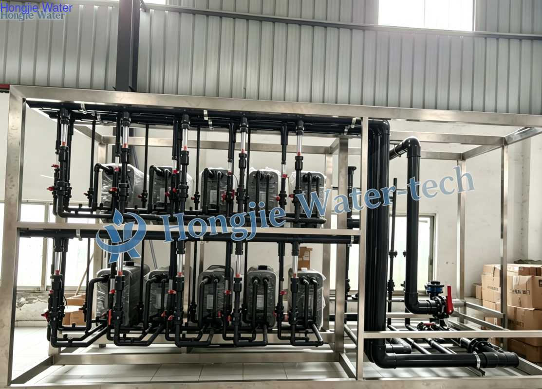 Our 15T/H EDI features continuous regeneration. It uses electrolytic regeneration (no acid/alkali). Resin removes ions; H⁺/OH⁻ regenerate resin; constant power supply discharges ions, ensuring stable 15T/H output and low cost.